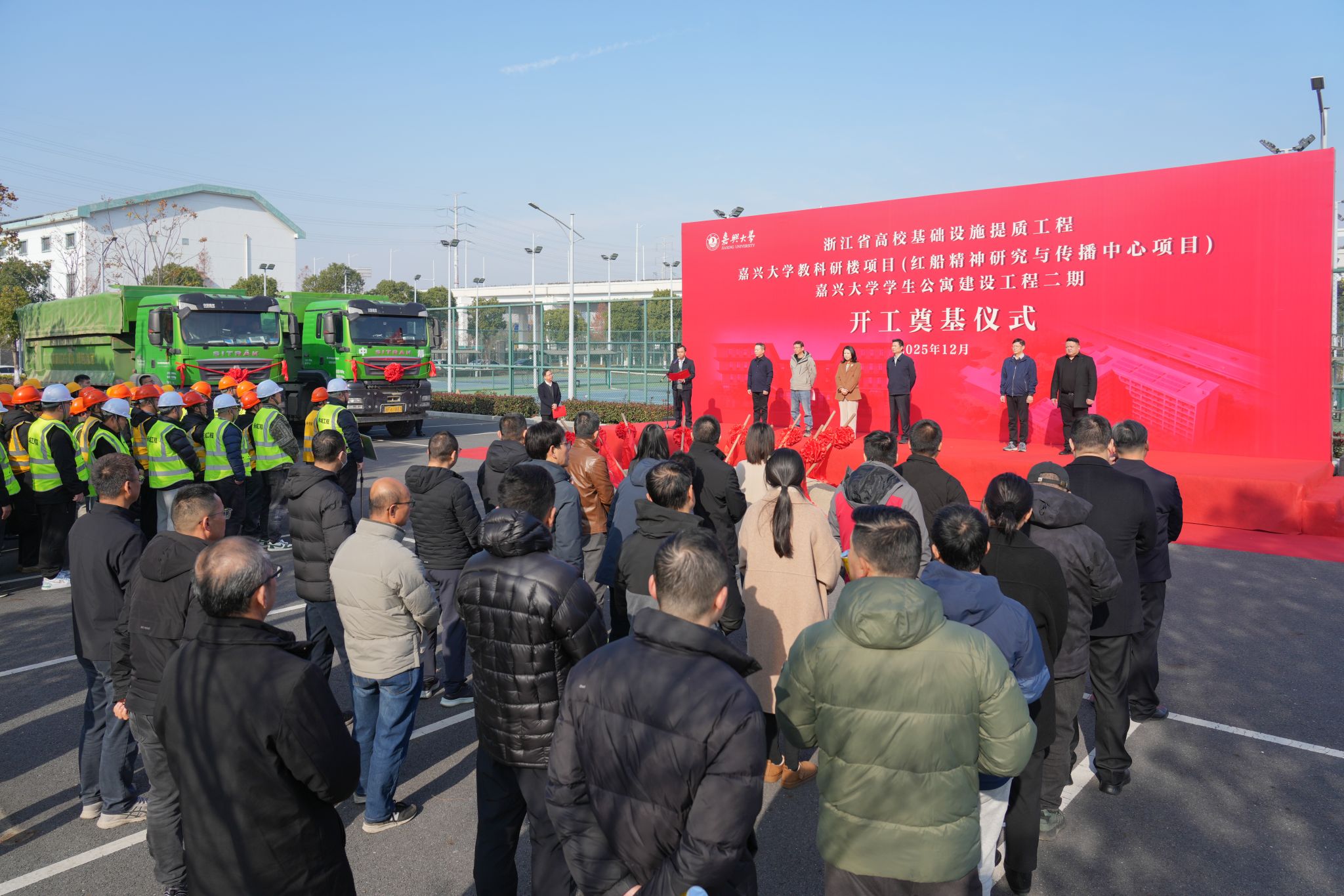 “嘉兴大学教科研楼项目、嘉兴大学学生公寓建设工程二期,现在开工!”沈希宣布工程开工。出席仪式的领导和嘉宾共同挥锹培土为项目奠基,施工机械同时鸣笛、开挖土方,标志着该重大基建工程正式拉开建设序幕。